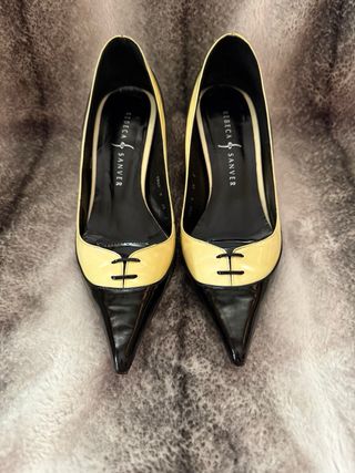 Elegantes zapatos de tacón de la marca Rebeca Sanver. - Diseño bicolor en negro y amarillo. - Punta afilada. - Detalle de cordones en la pala.