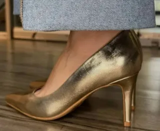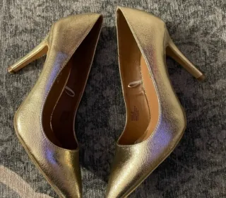Elegantes zapatos de tacón en color dorado. Un toque de brillo para cualquier ocasión. Nuevos sin estrenar,Ideales para estas fechas navideñas o cualquier ocasión 😍 - Diseño de punta fina. - Tacón de aguja.
