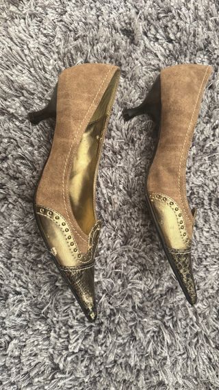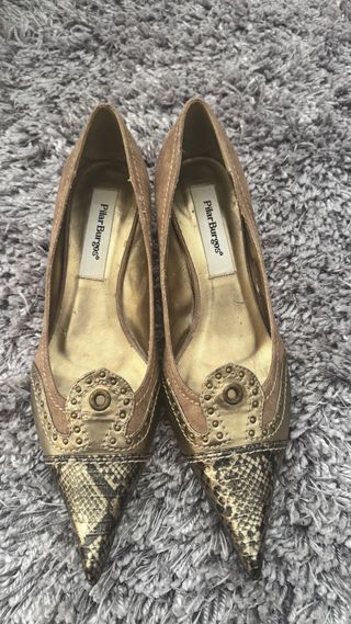 Elegantes zapatos de salón de la marca Pilar Burgos. - Diseño en punta con detalles de tachuelas. - Combinación de ante y piel con estampado de serpiente. - Color beige y dorado.