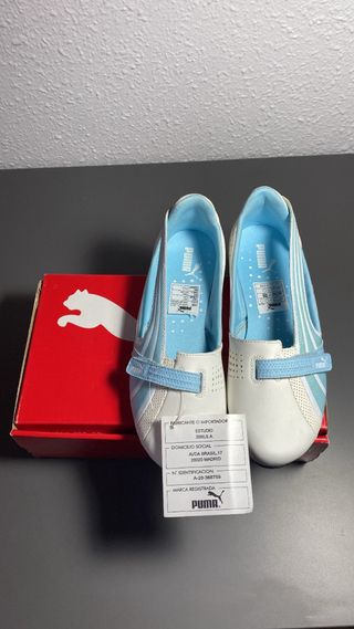 Bonitas zapatillas Puma estilo bailarina en tonos blanco y azul. Perfectas para un look casual y cómodo. - Diseño con detalles de rayas. - Cierre de tira con velcro. - Interior con logo de la marca.