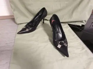 Elegante par de zapatos de tacón bajo (unos 4-5 cm) color negro con hebilla de adorno plateada en la parte delantera. Talla 43-44, muy cómodos, con signos de uso y desgaste, pero aún muy aprovechables. Hago envíos y puedo entregar en otras zonas de Madrid