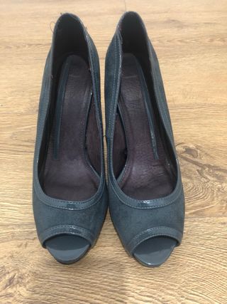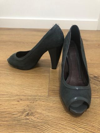 Elegantes zapatos de tacón con punta abierta. - Diseño peep toe. - Acabado en ante y charol.