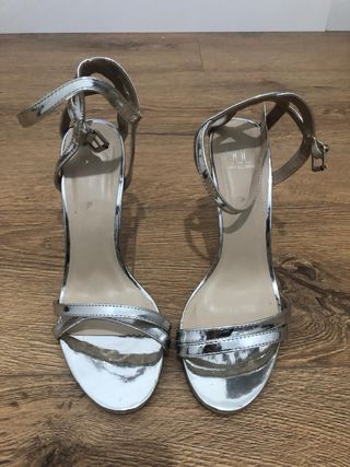 Elegantes zapatos de tacón con un acabado plateado brillante. Perfectos para añadir un toque de glamour a cualquier atuendo. - Diseño de tiras finas. - Cierre de hebilla en el tobillo. - Tacón de aguja.