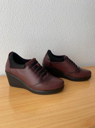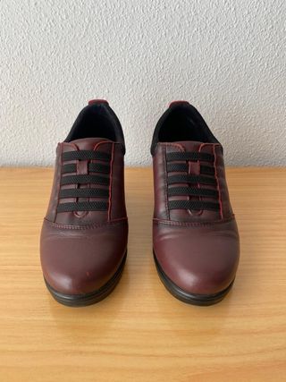 Zapatos Urban color burdeos, altura 6 cm, marca +48 HRS, talla 35. Suela antideslizante. Con gomas elásticas en el empeine. Usados 3 o 4 veces. En muy buen estado aunque como se puede apreciar en una de las fotos, el zapato derecho tiene una pequeña rozadura en la punta.