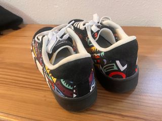 Zapatos de estilo urbano con un diseño llamativo. - Exterior negro con estampado geométrico multicolor. - Cordones blancos. - Suela blanca con detalles de rayas negras.