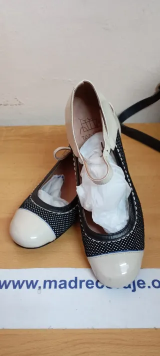 Zapatos tacon linea tandem con un diseño bicolor. - Combinación de negro y blanco. - Detalle de lunares en la parte delantera. - Punta y talón en charol blanco.