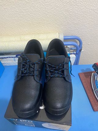 Zapatos de seguridad con cordones. - Diseño de cuero texturizado. - Costuras azules decorativas. - Suela de goma resistente.