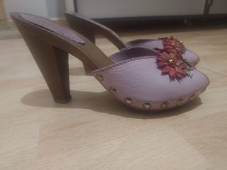 Zapatos de tacón con un diseño original y femenino. - Tacón de madera. - Adorno de flores en la pala. - Detalle de tachuelas metálicas.