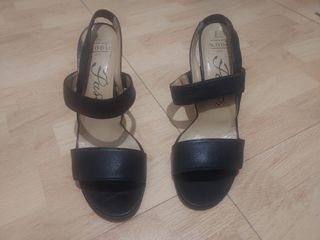 Elegantes zapatos de tacón negros, usados solo una vez para una ceremonia. - Diseño con tira en el tobillo. - Tacón grueso y plataforma. - Acabado brillante en el tacón y la tira.