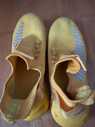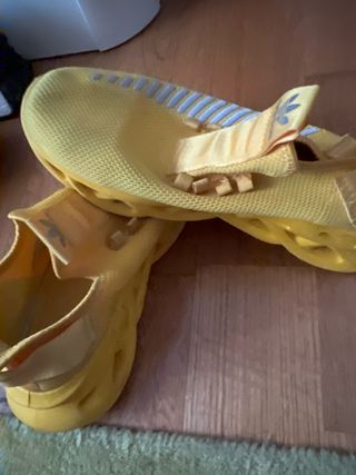 Zapatos deportivos Adidas en color amarillo, perfectos para un estilo casual y cómodo. - Diseño sin cordones para poner y quitar fácilmente. - Tira de ajuste en la parte superior. - Suela con perforaciones para ventilación.