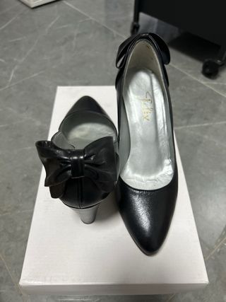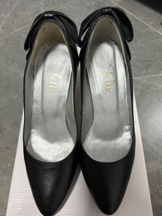 Elegantes zapatos negros de la marca Felix, usados solo una vez para una ceremonia. - Diseño de punta fina. - Detalle de lazo en la parte trasera. - Tacón alto.