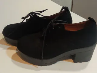 Zapatos negros con plataforma, 7,5x3,5, usados solo una vez. - Talla 39. - Diseño elegante. - Cierre con cordones. - Tacón de plataforma.