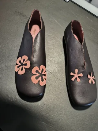 Zapatos Twin de piel de la marca Camper. - Color marrón con apliques de flores en color marrón rosado. - Diseño original y cómodo.