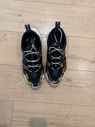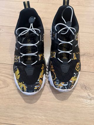 Zapatos Versace Couture con un diseño llamativo. - Estampado barroco en negro y dorado. - Cierre con cordones. - Suela blanca.
