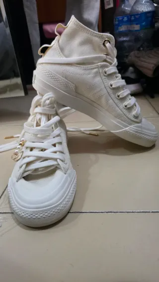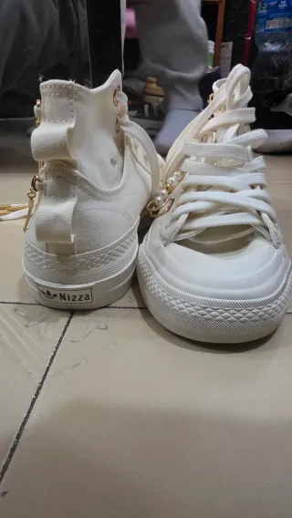 Zapatos de lona estilo botín de Adidas. - Diseño alto. - Cierre de cordones. - Detalle de perlas y charm. - Logo Nizza en la suela.