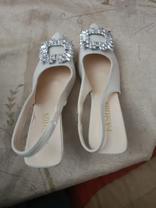 Elegantes zapatos de tacón destalonados, perfectos para ocasiones especiales. - Diseño destalonado con tira. - Adorno de pedrería brillante en la pala. - Tacón fino.