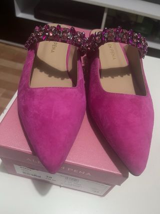 Elegantes zapatos planos de Alma en Pena en un vibrante color fucsia. Perfectos para añadir un toque de color y brillo a cualquier atuendo. - Diseño destalonado. - Adorno de pedrería en la tira. - Punta fina.