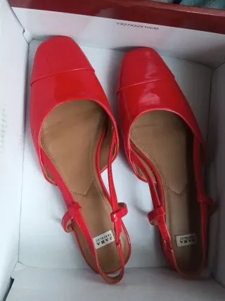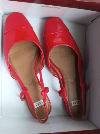 Elegantes zapatos planos de Zara en color rojo brillante. Perfectos para añadir un toque de color a cualquier atuendo. - Diseño destalonado con tira. - Acabado charol. - Talla 37.