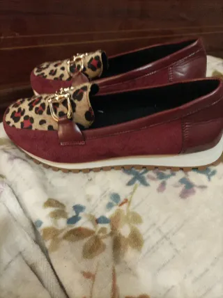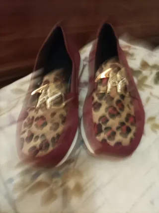 Elegantes mocasines con un diseño llamativo. - Combinación de estampado de leopardo y ante burdeos. - Detalle de hebilla dorada. - Suela de goma.