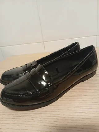 Elegantes zapatos planos de charol. - Diseño tipo mocasín. - Acabado brillante. - Suela de goma.