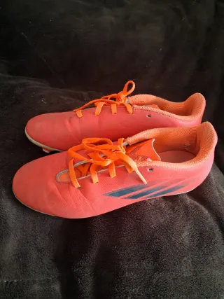 Zapatos de fútbol Adidas en color naranja brillante. Perfectos para jugar en césped. - Diseño deportivo. - Cordones naranjas. - Suela con tacos.
