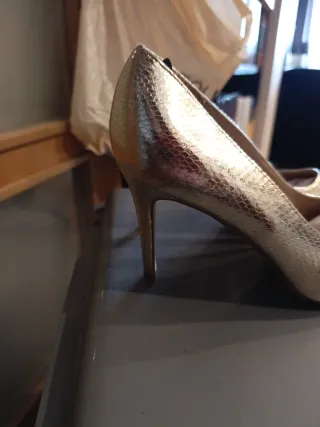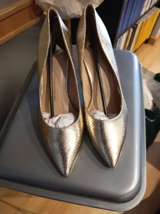 Elegantes zapatos de tacón con un acabado metalizado en tono dorado. El diseño es de punta afilada y el material imita la textura de la piel de serpiente. - Marca: Dorothy Perkins - Color: Dorado - Diseño: Punta afilada - Acabado: Efecto piel de serpiente - Tacón 9 cm. - POR LA COMPRA DE 5 ARTÍCULOS DE MI PERFIL REGALO EL DE MENOR IMPORTE. - NO SE HACEN ENVÍOS RECOGER EN GETAFE. ✓