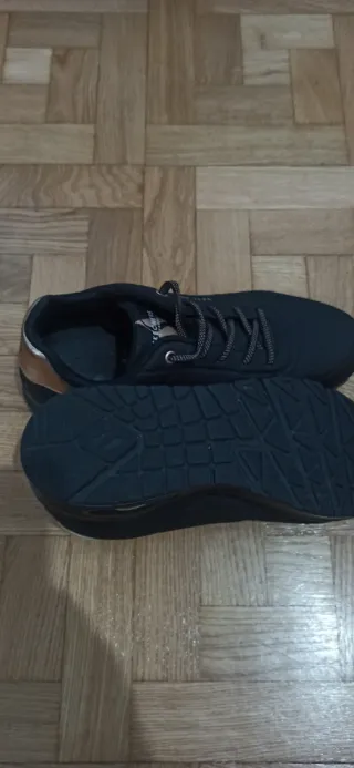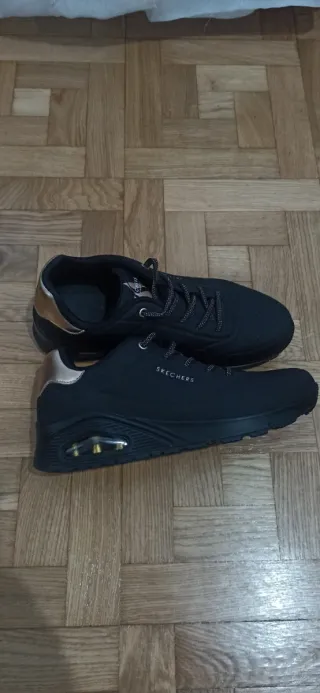 Zapatillas deportivas Skechers en color negro con detalles dorados.talla 39 de mujer,estan prácticamente nuevas,con caja,precio 25 euros - Cierre con cordones. - Detalle metálico en el talón. Zapatos de tacón de mango,talla 38 de mujer,marcas de uso ,pero en muy buen estado,precio 15 euros Botas de caña media de Mustang,talla 38 de mujer prácticamente nuevas precio 15 euros Bolso de pedro miralles original prácticamente nuevo,precio 25 euros Los artículos son de mi vecina,ella no tiene wallapop y le hago el favor de publicarlo, cualquier cosa preguntar por Manoli en el 685285971,entrega en mano Getafe centro