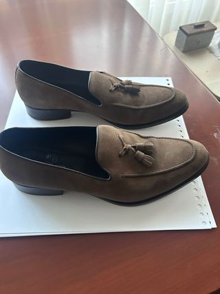 Elegantes zapatos de ante en color marrón, fabricados artesanalmente en España. - Diseño con borlas decorativas. - Acabado en ante suave.