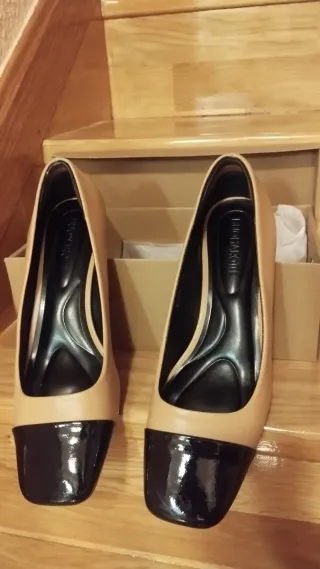 Elegantes zapatos de tacón con un diseño bicolor. - Punta reforzada en charol negro. - Tacón cómodo para uso diario. - Diseño tipo salón. - Marca visible en la plantilla.