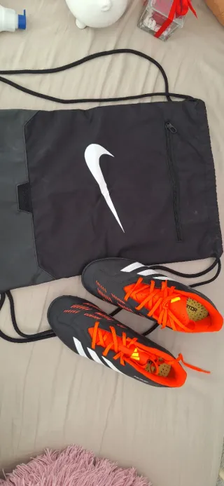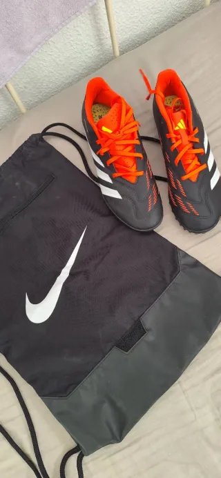 Zapatos de fútbol con cordones naranjas y detalles blancos. - Diseño deportivo. - Suela con tacos.
