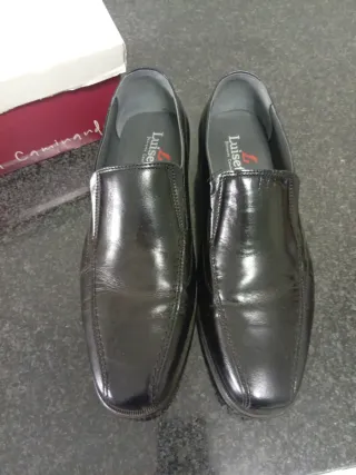Elegantes zapatos de vestir para caballero de la marca Fluchos. - Color negro. - Diseño clásico y cómodo. - Fabricados en España. - Piel fina - Están en muy buen estado, pero como se percibe en la foto uno tiene una raya
