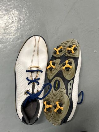 Zapatos de golf Footjoy en color blanco con detalles en azul. - Diseño clásico. - Cordones azules. - Suela con tacos para mayor agarre.