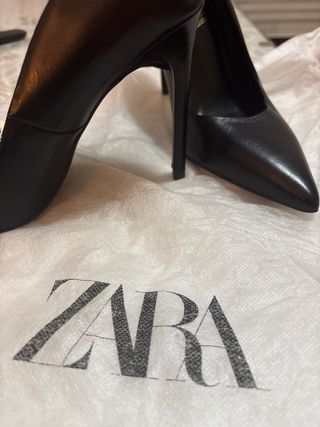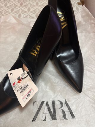 Elegantes zapatos de tacón de la marca Zara, con un diseño clásico y sofisticado. - Tacón fino. - Punta afilada. - Detalle de tira. - Logo dorado en la plantilla.