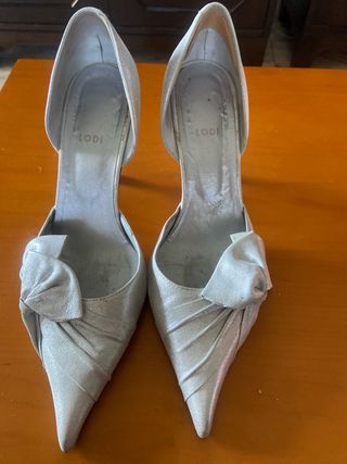 Elegantes zapatos de tacón plateados de la marca LODI. Un diseño sofisticado con un detalle de lazo. - Diseño de punta fina. - Detalle de lazo en la parte delantera. - Acabado brillante.