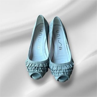 Elegantes zapatos de tacón Unisa en color gris. Presentan un diseño abierto en la punta y un detalle de volantes. - Tacón de altura media. - Material exterior de ante. - Detalle de volantes en la parte delantera. -La suela interior mide 24 cm. -Y el tacón mide 8 cm.