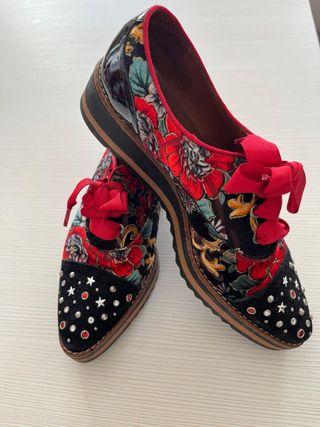 Zapatos de la colección Dansi para mujer. - Diseño con estampado floral. - Detalle de tachuelas y estrellas en la puntera. - Lazos rojos. - Suela de plataforma.