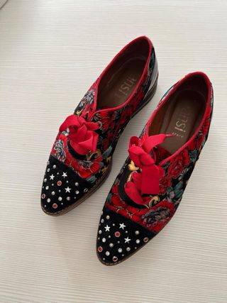 Zapatos de la marca Nuñez de Arenas en color azul. - Diseño con detalle de bigote bordado. - Cierre de cordones. - Suela blanca. ✅ Puestos muy pocas veces, no me acostumbro a zapatos, solo llevo zapatillas.