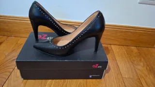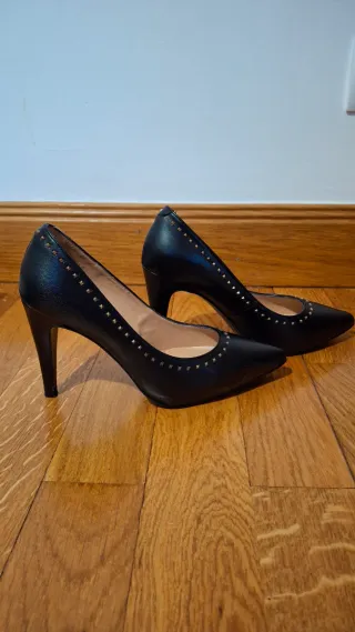 Usados sólo 1 día. PVP 115€ Elegantes zapatos de tacón negros con un diseño moderno. - Detalle de tachuelas doradas en el contorno. - Punta fina y tacón de aguja. - Acabado liso y sofisticado.