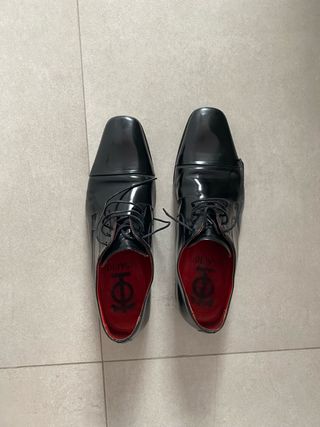 Elegantes zapatos de vestir. - Diseño clásico. - Acabado brillante. - Cordones negros. - Interior en color rojo.