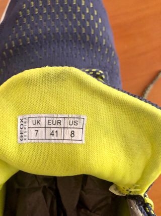 Zapatos deportivos Geox en talla 41. Combinan un diseño moderno con detalles llamativos. - Parte superior de malla transpirable. - Cordones bicolor en azul y amarillo. - Tirador trasero para facilitar el calce. - Suela blanca y flexible.