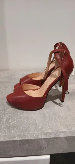 Elegantes zapatos de tacón con un diseño moderno y sofisticado. Perfectos para complementar cualquier atuendo. - Color: rojo/marrón. - Material: imitación piel. - Cierre con pulsera al tobillo. - Punta abierta.