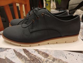 Zapatos de vestir para mujer, perfectos para otoño y primavera. Tienen un diseño moderno y elegante. - Color azul. - Talla 39. - Material con microperforaciones. - Cierre con cordones. - Suela de goma.