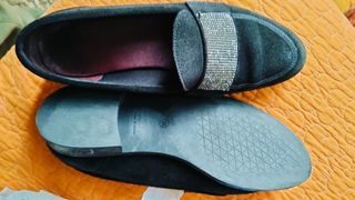 Elegantes zapatos planos para mujer con un toque de brillo. - Diseño de ante negro. - Adorno frontal con pedrería plateada.