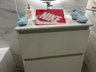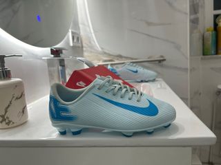 Zapatos de fútbol con un diseño moderno y llamativo. - Combinación de colores azul y blanco. - Marca reconocida por su calidad deportiva. la caja está pintada porque mi hermano lo pintó