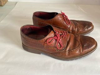 Elegantes zapatos de vestir de cuero. - Color marrón. - Cordones rojos. - Diseño con picado.