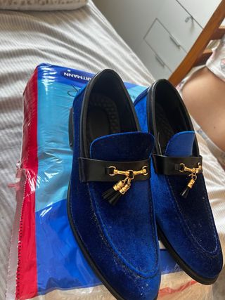 Elegantes zapatos de terciopelo azul con un toque de distinción. - Material: Terciopelo. - Adorno: Detalle metálico dorado con borlas. - Estilo: Mocasines.