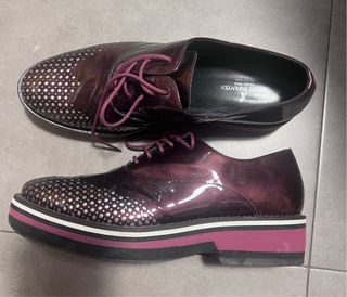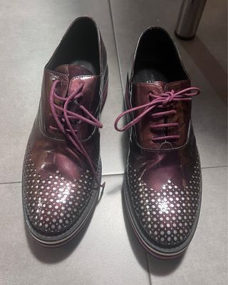 Atención Perdonalizados Puesto y no estrenados una suela nueva altura mas 7mm. Elegantes zapatos de charol con detalle de perforaciones. - Marca: Angel Infantes - Color: Morado y plateado - Diseño con cordones - Suela gruesa con detalles de color
