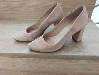 Elegantes zapatos de tacón alto con un diseño de punta fina. El material es ante, lo que les da un acabado suave y sofisticado.Tiene algún pequeño desperfecto por roce , se ve en las fotos - Tacón grueso. - Diseño de punta fina. - Material de ante.
