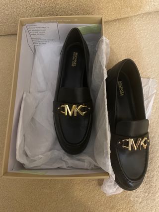 Elegantes mocasines Michael Kors para mujer en color negro. Presentan un distintivo logo MK dorado en la parte delantera. - Diseño de mocasín. - Detalle de logo MK dorado.