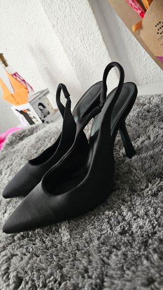 Elegantes zapatos de tacón de la marca Zara. - Diseño de punta fina. - Tira elástica en el talón. - Tacón fino y curvo. - Pequeña imperfección visible en la tira del talón.